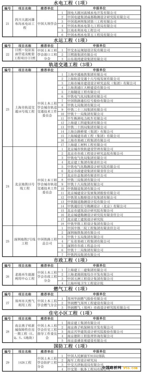 第十四屆中國土木工程詹天佑獎(jiǎng)總共有29項(xiàng)工程項(xiàng)目獲獎(jiǎng),其中建筑工程9項(xiàng),橋梁工程4項(xiàng),鐵道和隧道工程各2項(xiàng),公路工程3項(xiàng),水利水電和水運(yùn)工程各1項(xiàng),軌道交通工程3項(xiàng),市政工程、燃?xì)夤こ?、住宅小區(qū)和國防工程各1項(xiàng)。